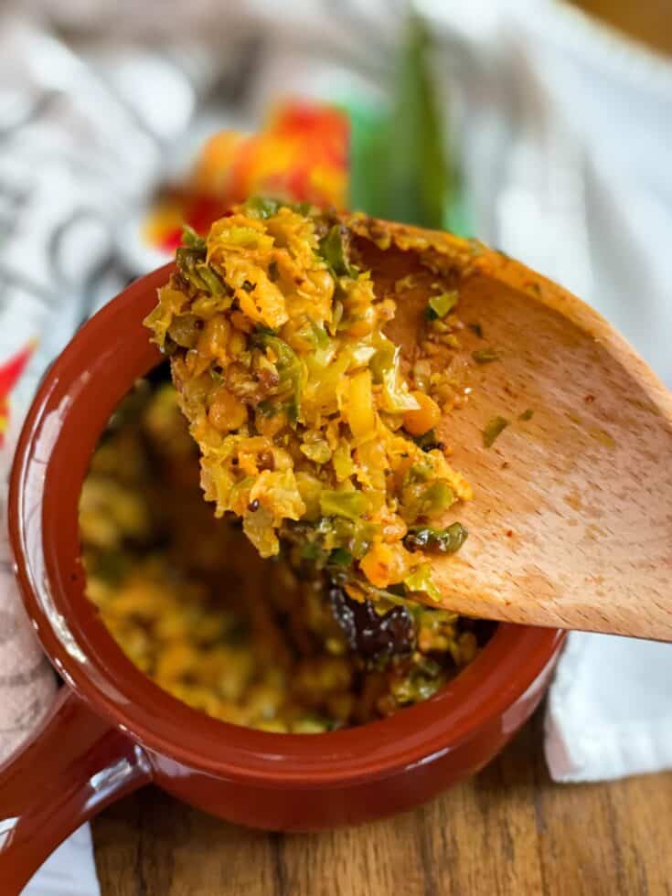 Stir fry, Poriyal, Thoran, Kobbari koora, vepudu, whatever you call it, Its one delicious side dish you need to try. Its a dry sabzi or curry and goes really well with rice or roti. This traditional recipe gets a makeover by adding Brussels sprouts to the Chana dal or Split chickpeas and pressure cooked in Instant pot for a quick weeknight meal.