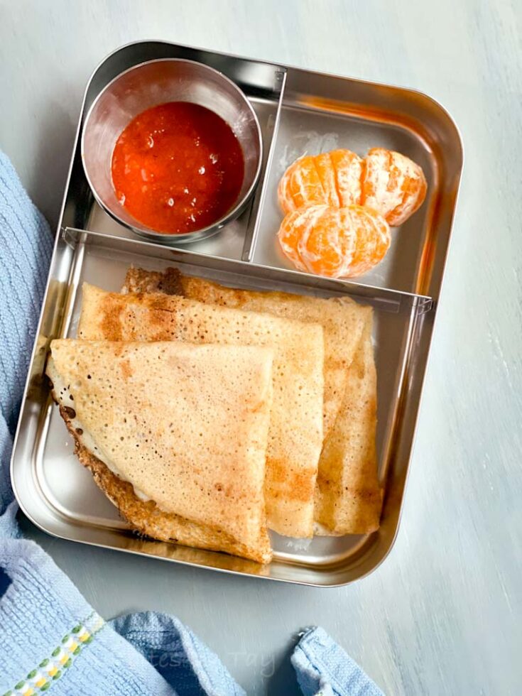 My kids love dosas anytime of the day. This steel cut oats dosa stay nice and soft in the lunchbox till lunchtime and they are super quick to pack up. I make the batter over the weekend, so packing dosas for lunch is my favorite thing! My daughter likes pairing the dosa up with a tangy mango pickle.