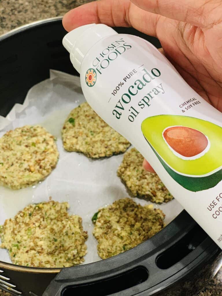 - Line the inside of air fryer with a parchment paper and spray with avocado oil spray.