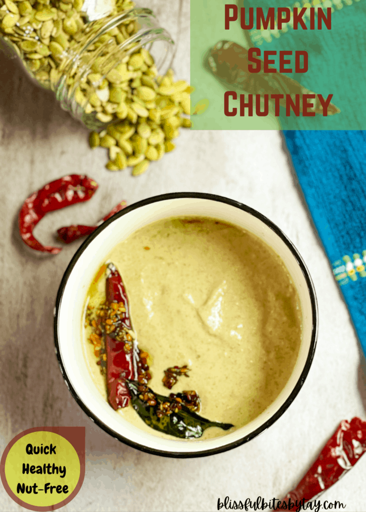 Pumpkin seed or Pepitas are a great alternative to nuts and make an amazing chutney for Idlis and dosas. This is a quick recipe that can be made in 15 minutes and with very few ingredients. Its Vegan, Gluten-free, nut-free and absolutely delicious!