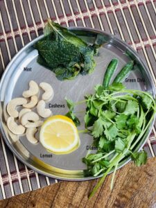 Grind mint, cilantro, cashews, green chili, salt and lemon juice to a smooth paste to make a quick Green chutney. Add water, if needed, to make a fine paste. You can use sunflower seeds for a nut-free option.
